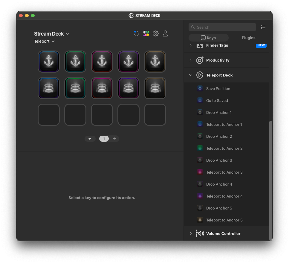 Download and install the Teleport Stream Deck add-on by opening the file with Stream Deck. Then, drag and drop the Anchor and Teleport buttons into your desired positions in the layout. You are now ready to start using the plugin.