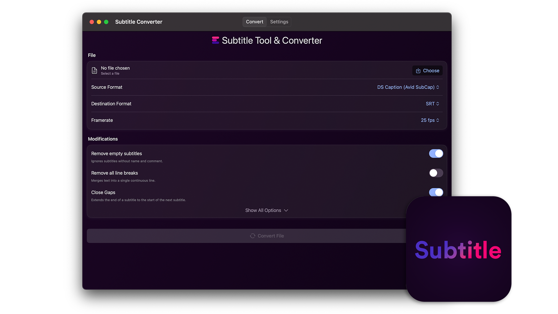 将字幕转换为其他文件格式,如 SRT、VTT、SBV,或使用该工具检查字幕的指南、修复、更正或移动。您还可以将字幕转换为标记并在编辑程序中使用。